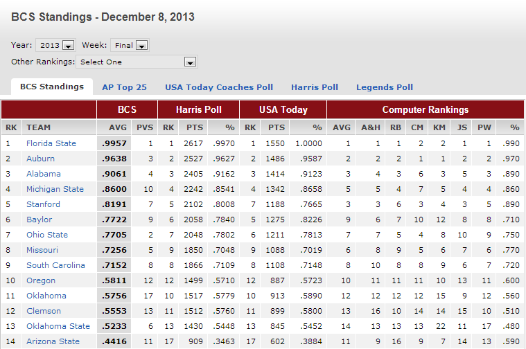 With college football’s 2013 regular season complete, the die has been cast for the final bowl pairings under the BCS system. Next year, or in exactly 385 days, 9 hours, 56 minutes, and 25 seconds as of this writing, the College Football Playoff © will be in place. With the death of the BCS effectively accomplished, this is a good time to consider how the college football world will be different 385 days, 9 hours, 52 minutes, and 34 seconds from now.
