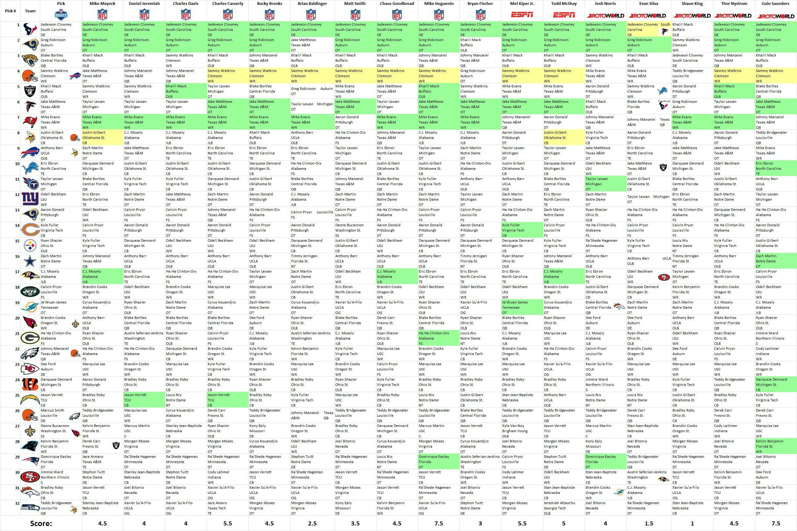The green boxes highlight totally correct picks and the yellow boxes highlight the correct player but the wrong team (when teams traded picks). The scores at the bottom are the number of totally correct picks plus half the number of partially correct picks. No analyst listed has more than one partially correct pick.