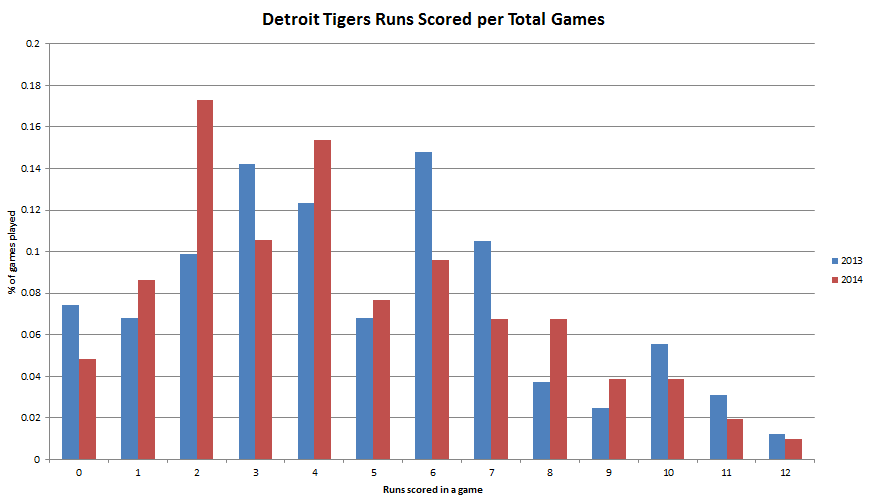 Charting a comparison of the 2014 and 2013 Tigers’ number of runs scored per total games (by which I attempt to mean the number of games in which the team scored one run, two runs, three runs, etc.), may be a starting point, however. Because the two teams, to date, have played a different number of regular-season games (104 and 162, respectively), this information is presented as a percentage of total games to allow for closer comparison. I also cut off everything above twelve-run games because of incongruities beyond that point. (Click the image to enlarge it.)