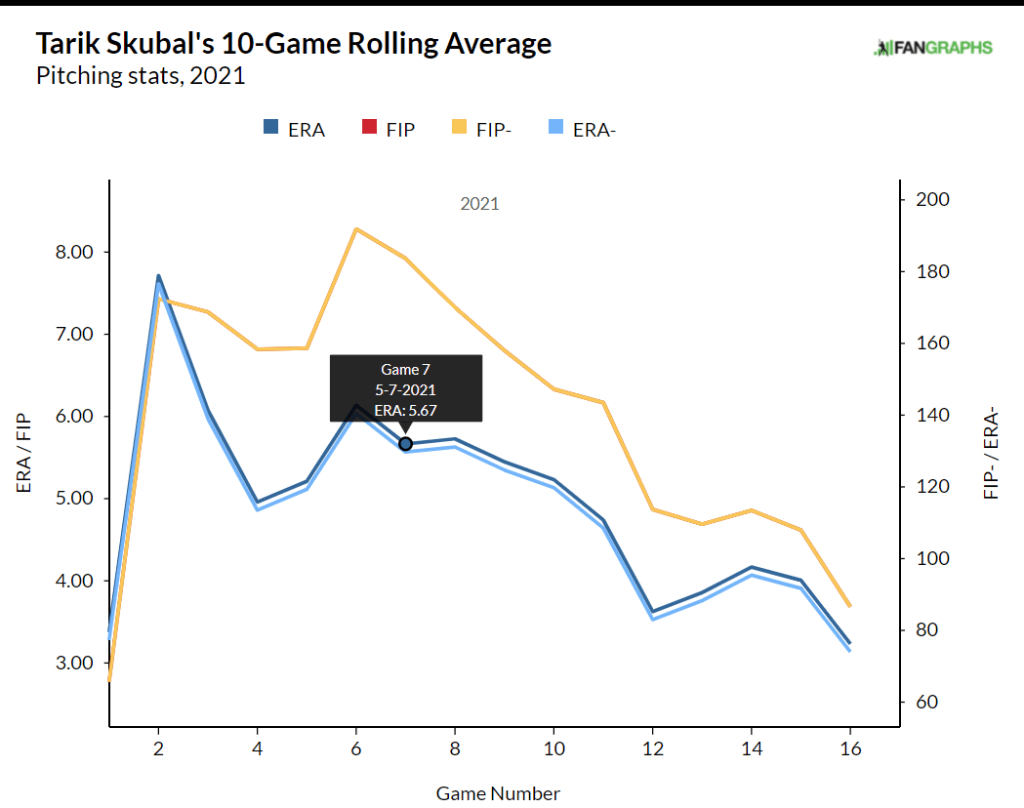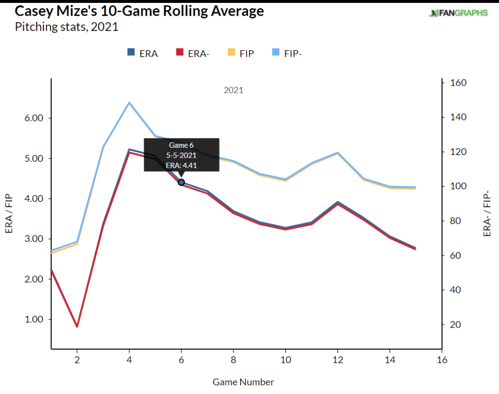 On the pitching side, it’s starting to feel like the next generation of Detroit starters is arriving. While there’s more volatility here, Casey Mize, Tarik Skubal, and Spencer Turnbull all seem like they’ve been hitting some decent strides. Turnbull’s missed a little time with a forearm strain, but, since May 8, Skubal’s been a top-twenty pitcher by FIP (3.42) and fWAR (1.1), while Mize has been in that same tier for ERA (2.91) and BB/9 (1.94). A couple graphs visually confirm that these guys have shown steady improvement since early May: