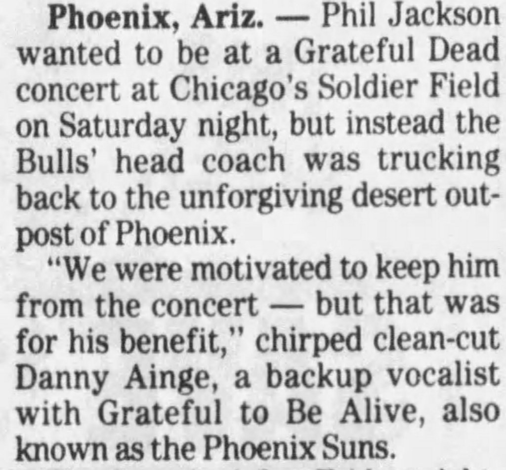But was the Grateful Dead aware that an especially lanky fan had been deprived of the opportunity to join them on that Saturday night in Chicago? I like to think the “Long Way To Go Home” and “Truckin'” sequence early in Saturday’s second set was a nod to the Chicago-to-Phoenix-to-Chicago detour Friday night’s loss required Jackson’s Bulls to make. Listen for yourself here.