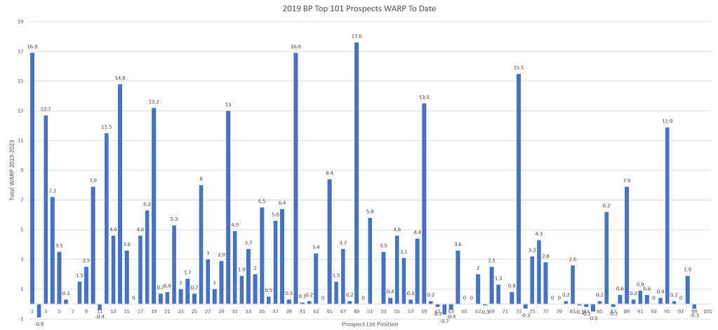 - Biggest miss? Probably Jo Adell (#2, -0.9 WARP) or Forrest Whitley (#7, yet to debut).