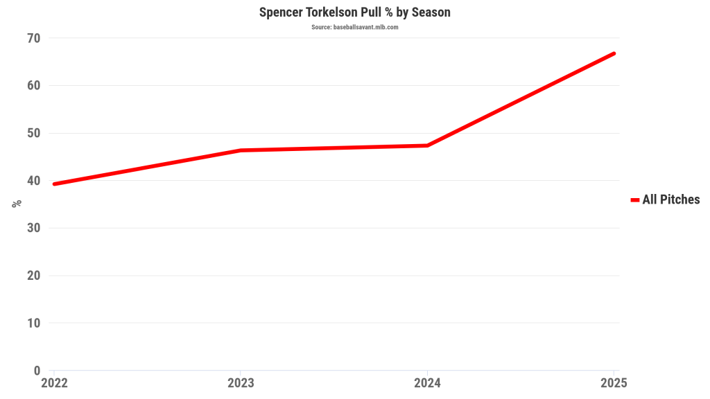 How is the former confirmed bust doing this? To my amateur eye, the key thing looks like pull rate. He isn’t swinging faster or generating more hard contact than before, nor has he increased his launch angle; in fact, all of those things are ticking down in 2025. Instead of trying to spread his contact to all fields, though, Torkelson is absolutely cranking on everything on which he can get his bat to his pull (power) side. Not everybody can be Miguel Cabrera, obviously, and sometimes it can help to stop pretending otherwise.