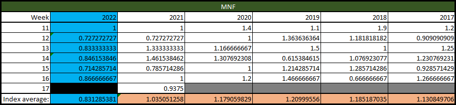 Some good news: Not only does ALDLAND’s MNF Index generate results, but it also gets results. Beginning in the 2023 NFL season, Monday Night Football will be subject to flex scheduling. This option should allow ESPN to buoy the quality of its flagging showcase and, if executed effectively on an ongoing basis, could cement the 2022 MNF season as the worst-ever MNF season ever.