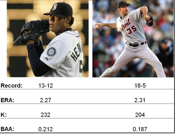 During Justin Verlander’s 8K, 1 run, 7 2/3 inning retribution against the Twins last night that ended in a 7-1 Tiger victory, the Fox Sports Detroit crew ran a graphic comparing Verlander’s numbers so far this season with the 2010 final season numbers for Felix Hernandez, the reigning AL Cy Young winner. The comparison looked something* like this: