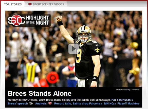 Drew Brees broke Dan Marino’s 27-year-old single-season passing record last night with a game and a quarter to spare. This morning, ESPN.com lead with “[The] Brees Stands Alone.” Hi-ho the dairy-o. In the words of Horatio Sanz (as Joe Bouchard), what does that mean?