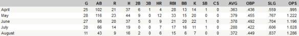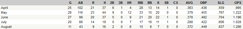 I’ve already noted that Miguel Cabrera is following up his 2012 season– in which he won both the MVP and Triple Crown– with an even better 2013. This month, it is widely becoming clear we are witnessing a special season from the Detroit third baseman, who is becoming something of a living Babe Ruth-Kirk Gibson combination. Due to injuries, Cabrera basically is playing on one leg, making it difficult to do things like run the bases. His response has been to hit a lot of home runs so he doesn’t have to run the bases. He has sixteen hits in eleven games in August, and six of them were homers. Here are his numbers through last night, broken out by month: