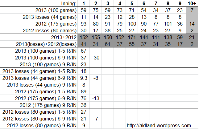 ALDLAND celebrated tax day this year by taking a dive into the numbers behind the Detroit Tigers’ offensive production. Since last season, I had developed the feeling that this should-be offensive power was having trouble scoring late in games, hamstringing their ability to mount comebacks and generally secure a win in the later innings, and I wanted to investigate to see whether that really was the case.